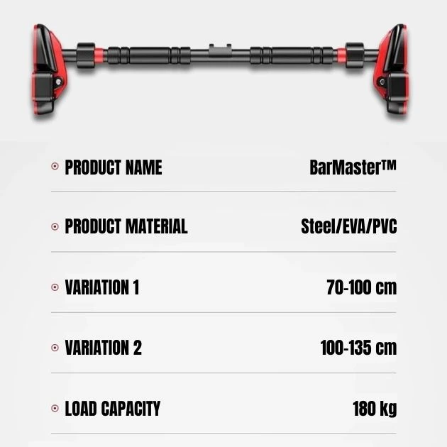 Ismerd meg a BarMaster™-t — egy forradalmi fitneszeszközt, amely a legmodernebb stabilitást ötvözi a letisztult, könnyen használható dizájnnal. A robusztus, háromszögletű, 4 pontos szerkezetének és ügyes többzáras rendszerének köszönhetően ez a rúd páratlan támogatást nyújt a legintenzívebb edzéseidhez. Nincs szükség szerszámokra vagy fúrásra!
