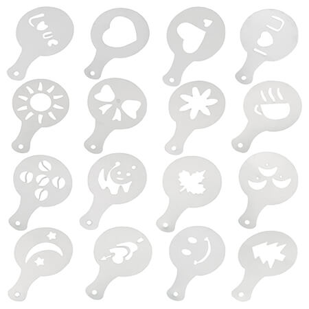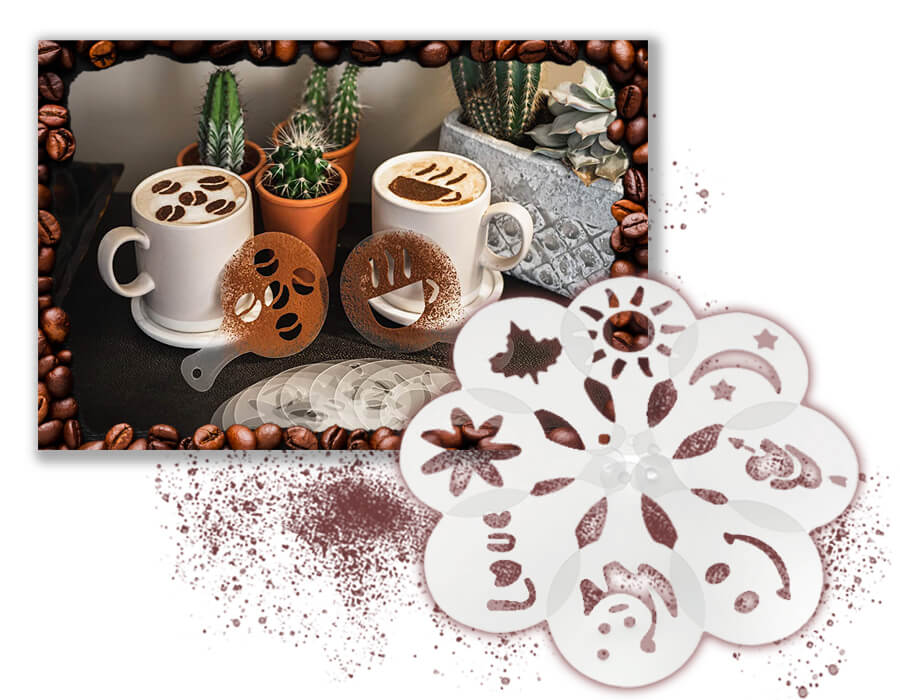 Este un fapt cunoscut că dragostea trece prin stomac. Dacă vrei să te răsfeți pe tine sau pe cei dragi cu un cappuccino parfumat, decorează-l cu puțină pudra de cacao. Șabloanele noastre asigură desene perfecte de fiecare dată, iar cele 16 modele îți permit să transmiți întotdeauna emoția potrivită.