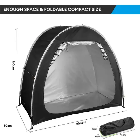 Zaštitite svoje stvari od sunca, kiše, prašine i prljavštine pomoću ovog svestranog, prenosivog skloništa. Lagano, sklopivo i jednostavno za postavljanje, savršeno je za bicikle, baštenski alat, motocikle, drvo i još mnogo toga. Čuvajte svoje stvari bezbednim i suvim gde god vam zatrebaju.