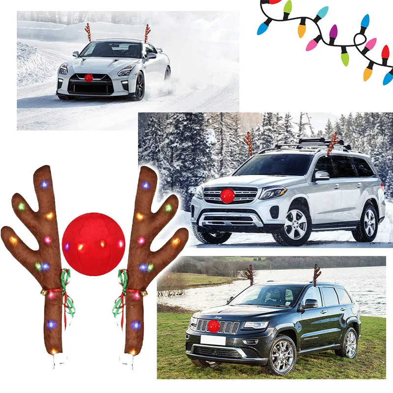 SantaRide™ Božićni komplet za ukrašavanje automobila s motivom kišnog jelena i svjetlima