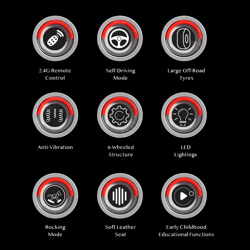 Pășește într-o lume a aventurilor palpitante cu mașina electrică cu șase roți Hexeon™! Concepută perfect pentru tinerii aventurieri, această mașinuță promite ore întregi de distracție cu motoarele sale puternice, sistemele de transmisie fluide și capacitatea de a merge înainte și înapoi. Fie că se plimbă prin curte sau explorează drumuri noi, Hexeon™ oferă emoție la fiecare pas. Lăsați călătoria să înceapă!